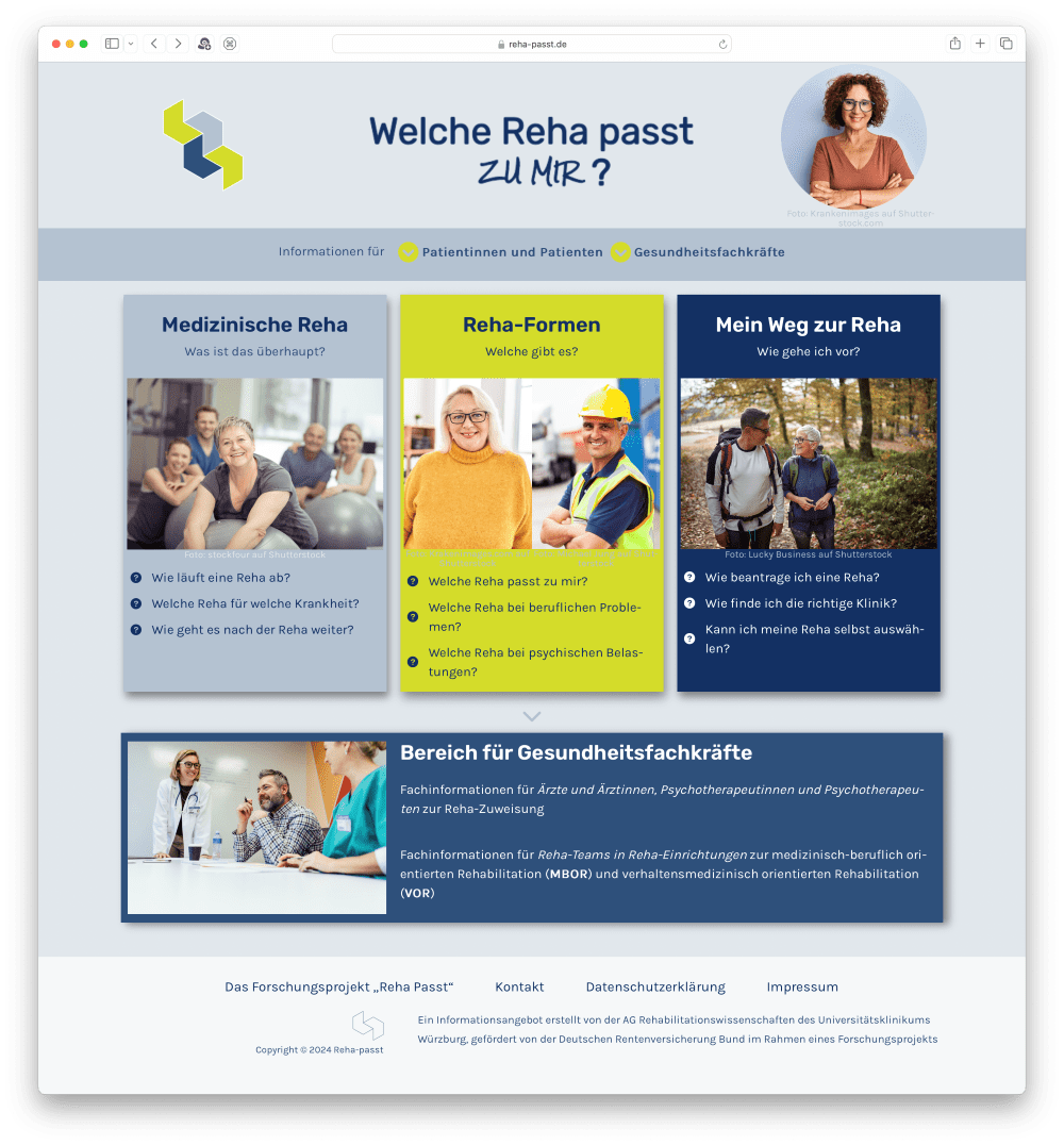 Die Webseite bietet Informationen rund um die medizinische Rehabilitation. Insbesondere werden die innovativen Konzepte der verhaltensmedizinisch orientierten Rehabilitation (VOR) und der medizinisch-beruflich orientierten Rehabilitation (MBOR) vorgestellt. Ein Schwerpunkt liegt auf Menschen mit psychischen Belastungen, da diese – oft in Kombination mit beruflichen Belastungen – zunehmend Anlass für Rehabilitationsanträge sind. Bei der Aufbereitung der Inhalte wird besonderer Wert auf eine multimediale und leicht zugängliche Darstellung gelegt, so gibt es unter anderem einen Selbsttest und kurze Erklärvideos. Dadurch soll die Gesundheitskompetenz der breiten Zielgruppe potenzieller Rehabilitandinnen und Rehabilitanden gefördert werden.