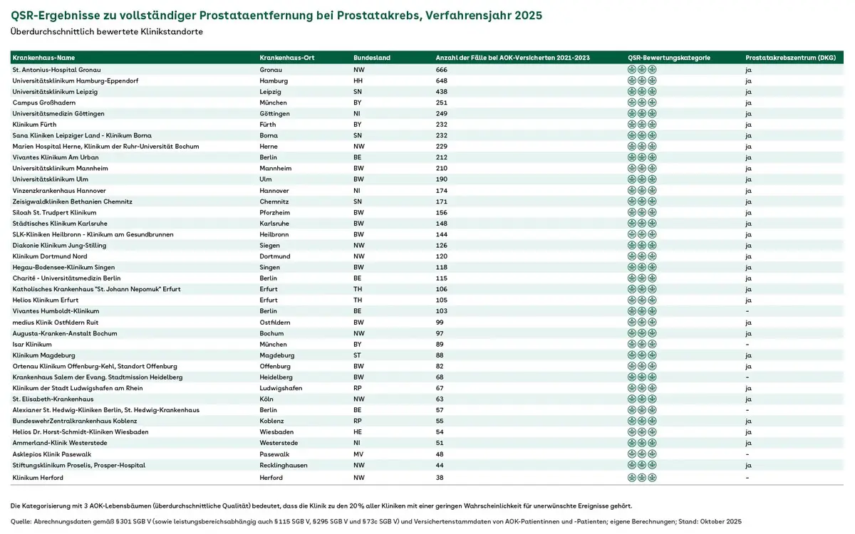 Im Jahr 2024 fanden bundesweit rund 34.700 radikale Prostatektomien statt. Die Analysen erfassen nur Komplikationen bis zu einem Jahr, nicht Inkontinenz oder Impotenz.